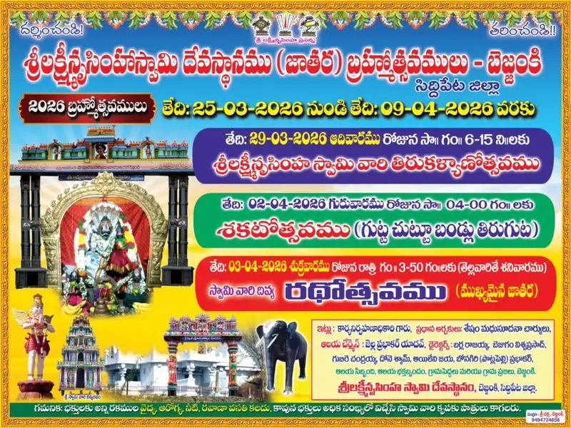 సిద్దిపేట జిల్లా బెజ్జంకి మండలం కేంద్రంలో ఏకశిలా గుట్టపై కొలువుదీరిన బెజ్జంకి లక్ష్మీ నరసింహస్వామి జాతర ఈ నె