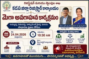 కడప జిల్లా ప్రజావాణి న్యూస్ (ఏప్రిల్23) కడప జిల్లా రిజిస్ట్రేషన్ మరియు స్టాంపుల శాఖ ఆధ్వర్యంలో ప్రజలకు సేవలను మరింత సులభతరం చేయడం,వాల్యుయేషన్ మరియు రిజిస్ట్రేషన్ ప్రక్రియలపై అవగాహన పెంపొందించడం లక్ష్యంగా మెగా అవగాహన కార్యక్రమం నిర్వహించబడుతుంది.ఈ కార్యక్రమానికి రియల్టర్లు, డెవలపర్లు, డాక్యుమెంట్ రైటర్లు మరియు సాధారణ ప్రజలను ఆహ్వానిస్తున్నాము. కార్యక్రమ ముఖ్యాంశాలు గ్రౌండ్ లెవల్స మస్యలపై చర్చ మరియు పరిష్కారాలు వాల్యుయేషన్ & రిజిస్ట్రేషన్ విధానాలపై స్పష్టమైన అవగాహన ఆదాయ వృద్ధికి సంబంధించి సూచనలు సేకరణ పాల్గొనవలసిన వారు రియల్టర్లు డెవలపర్లు డాక్యుమెంట్ రైటర్లు సాధారణ ప్రజలు ఈ కార్యక్రమంలో ప్రజల భాగస్వామ్యం అత్యంత ముఖ్యమని,అందరూ పెద్ద సంఖ్యలో పాల్గొని కార్యక్రమాన్ని విజయవంతం చేయవలసిందిగా కోరుతున్నాము.శ్రీ పి.రామ లక్ష్మిపట్నాయక్ డిప్యూటీ ఇన్స్పెక్టర్ జనరల్,కడప శ్రీ పి.వి.ఎన్.బాబు,జిల్లా రిజిస్ట్రార్,కడప ముగింపు సందేశంఅవగాహనతో ముందడుగు పారదర్శకతతో అభివృద్ధి సాధ్యం