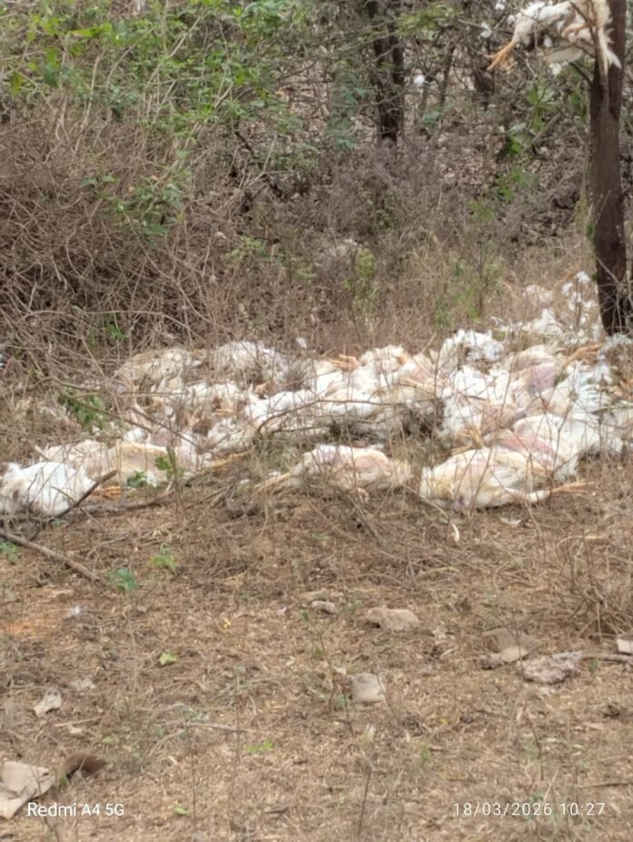 కాకరవాయి, జూపెడ మధ్య ప్రధాన రహదారి పక్కన గుర్తు తెలియని వ్యక్తులు బొలెరో వాహనంలో తీసుకువచ్చి వందల సంఖ్యలో చనిపోయిన కోళ్లను పడేసి వెళ్లిన ఘటన స్థానికంగా కలకలం రేపుతోంది. నెంబర్ ప్లేట్ లేని వాహనంతో వచ్చి ఈ దారుణానికి పాల్పడ్డారని స్థానికులు చెబుతున్నారు.ఈ ఘటన వెనుక కూడలి గ్రామానికి చెందిన ఓ కోళ్ల ఫారం వ్యాపారి ఉండవచ్చనే అనుమానాలు వ్యక్తమవుతున్నాయి. రహదారి పక్కన పడేసిన కోళ్ల వల్ల తీవ్ర దుర్వాసన వ్యాపిస్తూ, ఈగలు, కుక్కల సంచారం పెరిగి ప్రజలకు ఇబ్బందులు కలుగుతున్నాయి.