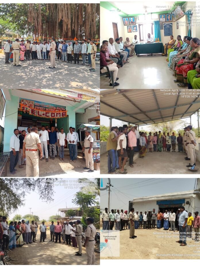 నేరాల నివారణలో సీసీ కెమెరాలు కీలకపాత్ర పోషిస్తాయని సిద్దిపేట జిల్లా కోహెడ మండల పోలీస్ స్టేషన్ పరిధిలోని గ్రామాల్లో పోలీస్ అధికారులు అవగాహన కార్యక్రమాలు నిర్వహించారు.ఈ కార్యక్రమంలో భాగంగా వీపీఓ అధికారులు గ్రామాలను సందర్శించి, గ్రామ పెద్దలు మరియు స్థానిక ప్రజలతో సమావేశాలు ఏర్పాటు చేశారు.ఈ సందర్భంగా పోలీసు అధికారులు మాట్లాడుతూ గ్రామాల్లో సీసీ కెమెరాలు ఏర్పాటు చేయడం ద్వారా భద్రతను మరింత మెరుగుపరచవచ్చని, అసాంఘిక కార్యకలాపాలకు అడ్డుకట్ట వేయవచ్చని తెలిపారు. ప్రతి గ్రామంలో ప్రజాప్రతినిధులు, ప్రముఖులు ముందుకు వచ్చి సీసీ కెమెరాల ఏర్పాటుకు సహకరించాలని కోరారు.అదేవిధంగా, నిరుద్యోగ యువత కోసం సిద్దిపేటలో నిర్వహించనున్న పోలీస్ ఉద్యోగమిత్ర మెగా జాబ్ మేళా గురించి వివరించారు. చదువుకున్న యువతీ యువకులు ఆన్లైన్ ద్వారా దరఖాస్తు చేసుకోవాలని సూచించారు.ప్రజలకు పోలీస్ సేవలను మరింత చేరువ చేయడమే లక్ష్యంగా చేపట్టిన “మన ఊరు – మన పోలీస్” కార్యక్రమం ఉద్దేశాలను కూడా ఈ సమావేశంలో వివరించారు.