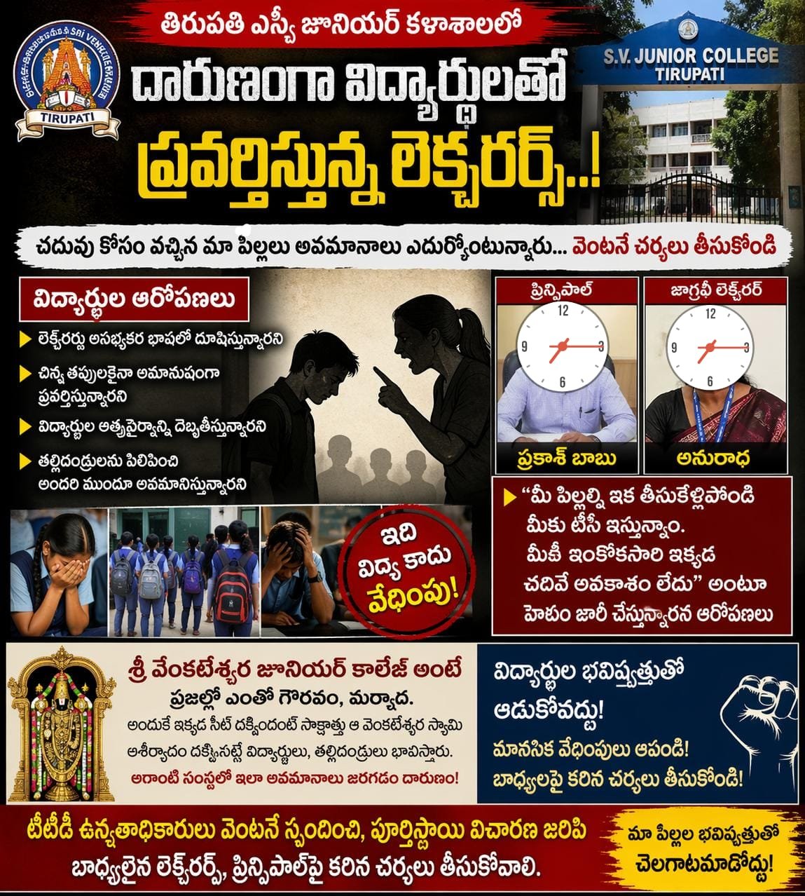 ప్రజావాణి న్యూస్ (ఏప్రిల్23) తిరుపతి ఎస్వీ జూనియర్ కాలేజీలో షాకింగ్ ఘటనలు,విద్యార్థుల భవిష్యత్తుతో ఆడుకోవడం సమంజసమా విద్యా సంస్థల్లో శిక్షణ పేరుతో మానసిక వేధింపులు ఎందుకు బాధ్యులపై చర్యలు ఎప్పుడో.చదువుతో భవిష్యత్తును నిర్మించుకోవాలని ఆశతో రాష్ట్రం నలుమూలల నుంచి వచ్చే విద్యార్థులకు ఆదర్శంగా నిలవాల్సిన ఎస్వీ జూనియర్ కాలేజీలో ఆందోళనకర పరిస్థితులు వెలుగులోకి వస్తున్నాయి.విద్యార్థుల ఆరోపణల ప్రకారం, కొంతమంది లెక్చరర్లు వారితో అమానుషంగా ప్రవర్తిస్తూ,అసభ్యకర భాషలో దూషిస్తూ మానసికంగా వేధిస్తున్నారని సమాచారం.చిన్నపాటి తప్పులను పెద్దవిగా చూపిస్తూ,విద్యార్థులను అవమానించడం, వారి ఆత్మస్థైర్యాన్ని దెబ్బతీయడం వంటి చర్యలు జరుగుతున్నాయని వారు వాపోతున్నారు.ఇంకా తీవ్ర ఆరోపణలు ఏమిటంటే-తల్లిదండ్రులను పిలిపించి,విద్యార్థులను అందరి ముందూ నిలబెట్టి అవమానించడం,మీ పిల్లలను వెంటనే తీసుకెళ్లండి… టీసీ ఇస్తాం” అంటూ బెదిరింపులకు దిగుతున్నారని చెబుతున్నారు.ఈ వ్యవహారంలో కాలేజీ ప్రిన్సిపాల్ ప్రకాష్ బాబు,జాగ్రఫీ లెక్చరర్ అనురాధ పాత్రపై విద్యార్థులు,తల్లిదండ్రులు తీవ్ర అసంతృప్తి వ్యక్తం చేస్తున్నారు.శ్రీ వెంకటేశ్వర విద్యాసంస్థలకు ఉన్న గౌరవం,విశ్వాసం దృష్ట్యా ఇక్కడ సీటు దక్కడం ఎంతో అదృష్టంగా భావించే తల్లిదండ్రులు,ఇప్పుడు ఈ ఘటనలతో తీవ్ర నిరాశకు గురవుతున్నారు.చదువు కోసం వచ్చిన మా పిల్లలు అవమానాలు ఎదుర్కొంటున్నారు,వెంటనే చర్యలు తీసుకోండి” అని తల్లిదండ్రులు డిమాండ్ చేస్తున్నారు.ఈ వ్యవహారంపై టీటీడీ ఉన్నతాధికారులు తక్షణమే స్పందించి, విచారణ జరిపి బాధ్యులపై కఠిన చర్యలు తీసుకోవాలని డిమాండ్లు వెల్లువెత్తుతున్నాయి.ఈ ఘటనలపై అధికారుల స్పందన ఏంటి,చర్యలు ఎప్పుడు,అనేది ఇప్పుడు కీలకం మారింది. ఇకనైనా సంబంధిత అధికారులు స్పందించి, విద్యార్థుల ఉజ్వల భవిష్యత్ ను కాపాడాల్సిన అవసరం ఉంది.