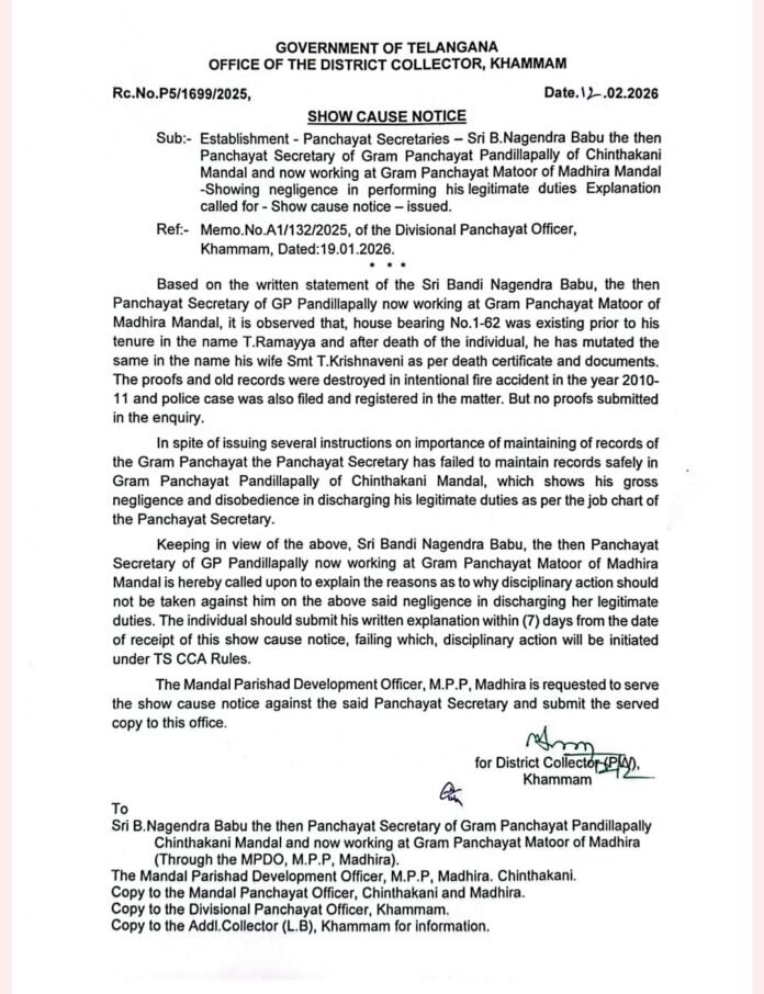 ఖమ్మం జిల్లా చింతకాని మండలం పందిళ్ళపల్లి పంచాయతీ పరిధిలోని సర్వే నెంబర్ 210 నందు బాధిత కుటుంబం కొనుగోలు చేసిన ఓ ప్లాటు ఇల్లు వ్యవహారంలో ఎట్టకేలకు మన ప్రజావాణి తెలుగు దినపత్రిక సంచలన సమగ్ర కథనాలు అందించిన నేపథ్యంలో జిల్లా కలెక్టర్ ఆదేశాల మేరకు సుమోటోగా స్వీకరించిన ఫిర్యాదు పై విచారణ క్షుణ్ణంగా చేసినట్లు అదేవిధంగా దీంట్లో కొన్ని వివరాలు పొందు పరుచ లేదనిబాధితు కుటుంబం ఆరోపిస్తోంది. ప్రధానంగా ఎటువంటి లింకు డాక్యుమెంట్లు ముటేషన్లు లేకుండా పంచాయతీ రికార్డులలో 2010 2011 2012లో నమోదు చేసిన ఆ నాగేంద్రుడు అవినీతి అక్రమాలకు అడ్డుపద్దు లేకుండా కొనసాగినట్లు గ్రామస్తులు బాధితులు ఆరోపిస్తున్నారు. సదరు పంచాయతీ కార్యదర్శి గ్రామంలో నిబంధనలకు విరుద్ధంగా పలు క్రమబద్ధీకరణలు చేసినట్లు అత్యంత విశ్వసనీయ సమాచారం మేరకు తెలుస్తోంది. కాగా సదురు పంచాయతీ కార్యదర్శి పందిళ్ళపల్లి గ్రామంలోని పంచాయతీ కార్యదర్శిగా విధులు కొనసాగిస్తున్న వేళ. సదరు పంచాయతీ కార్యదర్శి పందిళ్ళపల్లిలో తిష్ట వేసి ప్రభుత్వ నిబంధనలకు విరుద్ధంగా అవినీతికి పాల్పడినట్లు బాధితుల ఫిర్యాదు మేరకు తెలుస్తోంది