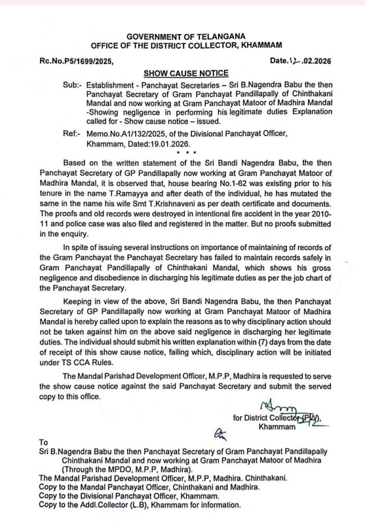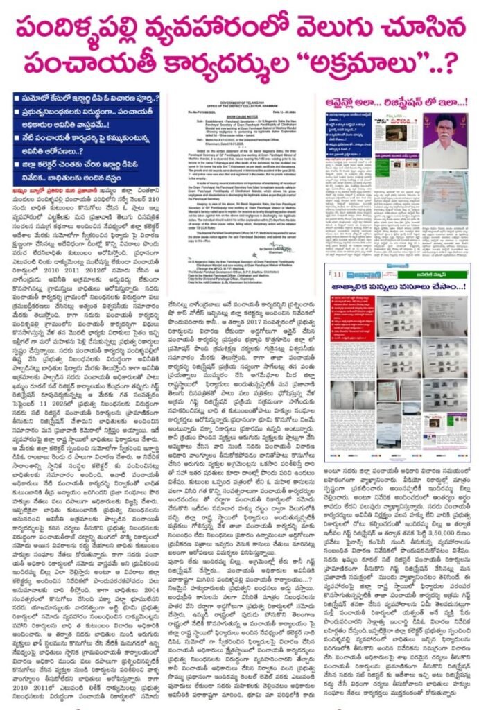 ఖమ్మం జిల్లా చింతకాని మండలం పందిళ్ళపల్లి గ్రామపంచాయతీ పరిధిలో సర్వేనెంబర్ 210 నందు ఓ బాధిత కుటుంబానికి చెందిన ఖాళీ స్థలంలో రేకుల షెడ్ను నాటి పంచాయతీ కార్యదర్శి ప్రభుత్వ నిబంధనలు ఉల్లంఘించి బాధితులకు బాధి తకుటుంబ సభ్యులకు సమాచారం లేకుండా ఎటువంటి ముటేషన్లు లింక్ డాక్యుమెంట్లు లేకుండా కమిషన్ల కక్కుర్తికి ఇష్టానుసారంగా వ్యవహరించి పందిళ్లపల్లి గ్రామానికి చెందిన ఓ మహిళకు గ్రామపంచాయతీ రికార్డులలో పేరు నమోదు చేసి తమ అధికారాన్ని నిర్లక్ష్యంగా దుర్వినియోగం చేశారని పందిళ్ళపల్లి గ్రామానికి చెందిన బాధిత కుటుంబం ప్రజావాణి గ్రీవెన్స్ లో దరఖాస్తు చేశారు. దీనికి తోడు మన ప్రజావాణి తెలుగు దినపత్రిక పలు సమగ్ర కథనాలు అందించిన నేపథ్యంలో కలెక్టర్ ఆదేశాల మేరకు నాటి డిపిఓ సుమోటోగా స్వీకరించి సమగ్ర విచారణ చేసి చర్యలు తీసుకునేందుకు ఆదేశించిన నేపథ్యంలో ప్రస్తుత ఇంచార్జ్ డిపిఓ స్థానిక గ్రామపంచాయతీ కార్యాలయం నందు విచారణ నిర్వహించారు అనంతరం ఖమ్మం జిల్లా కలెక్టరేట్లోని డిపిఓ కార్యాలయంలో మరో దశ విచారణ పూర్తి చేసి ఆ సందర్భంగా నాడు పందిళ్ళపల్లి గ్రామపంచాయతీలో 2009 2010 సంవత్సరం నందు విధులు నిర్వహించిన నాటి పంచాయతీ కార్యదర్శి నాగేంద్రబాబుకు డిపిఓ షోకాజ్ నోటీసు జారీ 15 రోజుల్లోగా వివరణ లిఖితపూర్వకంగా అందించాలని ఆదేశించి అనేక పరిణామాల నేపథ్యంలో షోకాజ్ నోటీస్ మధిర ఎంపీడీవో కార్యాలయం నుండి మరియు రిజిస్టర్ పోస్టు ద్వారా సదరు పంచాయతీ కార్యదర్శి చేరిందని తెలిసింది. నెలలు గడుస్తున్నప్పటికీ ఖమ్మం జిల్లా చింతకాని మండలం పందిళ్ళపల్లి ప్లాటు మరియు రేకుల షెడ్డు వ్యవహారంలో నాటి పంచాయతీ కార్యదర్శి నిర్లక్ష్యంగా అధికార దుర్వినియోగానికి పాల్పడినట్లు సంబంధిత విచారణలో వెలుగులోకి వచ్చినప్పటికీ ఆ మేరకు ధ్రువీకరించిన గానీ నేటి వరకు చర్యలు తీసుకోకపోవడం సర్వత్రాచర్చనీయాంశమైంది. ఇప్పటికైనా సంబంధిత జిల్లా కలెక్టర్ స్పందించి పందిళ్లపల్లి ప్లాట్ వ్యవహారంలో అధికార దుర్వినియోగానికి పాల్పడిన సంబంధిత పంచాయతీ కార్యదర్శి పై చర్యలు తీసుకో ని భవిష్యత్తులో ఇటువంటి చర్యలకు పాల్పడకుండా సమగ్ర చర్యలు తీసుకోవాలని బాధితులు ఒక ప్రకటనలో కోరారు.