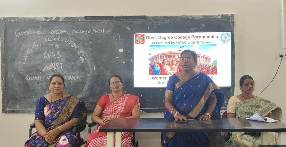 వై.ఎస్.ఆర్ కడప జిల్లాప్రజావాణిన్యూస్(ఏప్రిల్13)పోరుమామిళ్ల ప్రభుత్వ డిగ్రీ కళాశాలలో కళాశాల ప్రిన్సిపల్ డాక్టర్ శామ్యూల్ డేవిడ్ రాజ్ ఆదేశాల మేరకు ఉమన్ రిజర్వేషన్ బిల్- 2023 నారి శక్తి వందన అభియాన్ కార్యక్రమం కళాశాల ఉమెన్ ఎంపవర్మెంట్ సెల్ అధ్యక్షులు డాక్టర్ ఎం వి సులోచన ఆధ్వర్యంలో మహిళా విద్యార్థులకు ఉమెన్ రిజర్వేషన్ 2023 బిల్లుపై అవగాహన కల్పించారు. ఈ సందర్భంగా మహిళా అధ్యాపకులు మాట్లాడుతూ మహిళలు విద్యా ఉద్యోగ రంగాలతో పాటుగా రాజకీయ రంగంలో కూడా ఉత్తమంగా రాణించాలంటే మహిళలకు సంబంధించిన రిజర్వేషన్ బిల్ 2023 ను పార్లమెంటు ఆమోదం తెలిపి చట్ట రూపంలో రావాలని ఆకాంక్షించారు.ఈ కార్యక్రమంలో మహిళా అధ్యక్షులు డాక్టర్ సబితా, పర్వీన్, గుర్రమ్మ ఇతర అధ్యాపకులు విద్యార్థినులు పాల్గొన్నారు