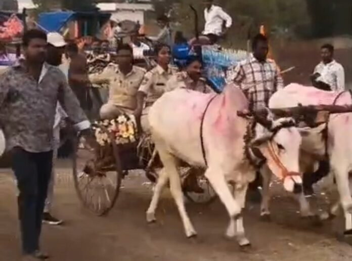 సిద్దిపేట జిల్లా బెజ్జంకి మండలంలో శ్రీ లక్ష్మీనరసింహస్వామి బ్రహ్మోత్సవాలు భక్తి శ్రద్ధలతో ఘనంగా నిర్వహించబడ్డాయి. ఈ సందర్భంగా నిర్వహించిన శకటోత్సవం ప్రత్యేక ఆకర్షణగా నిలిచింది.ఈ యొక్క ఉత్సవంలో భాగంగా సిద్దిపేట రూరల్ సీఐ శ్రీను స్వయంగా ఎద్దుల బండిపై సవారి చేయడం భక్తులను ఆకట్టుకుంది.అదే బండిపై బెజ్జంకి ఎస్సై సౌజన్య, కానిస్టేబుల్ కోడిసెల శ్రీనివాస్ కూడా పాల్గొనడం కార్యక్రమానికి మరింత ఉత్సాహాన్ని తెచ్చింది.