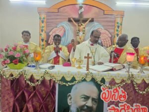 కడప జిల్లా ప్రజావాణి న్యూస్ (ఏప్రిల్18) ఖాజీపేట మండలం,మిడుతూరు హరిజనవాడలో పునీత పాట్రేపియో దేవాలయం (చర్చి) ప్రారంభోత్సవంలో పాల్గొన్న రెడ్యం సోదరులు.మిడుతూరు గ్రామ పెద్దలు,యువకులు ఆధ్వర్యంలో ఘనంగా,కన్నుల పండుగగా చర్చి ప్రారంభం.ఖాజీపేట మండలం, మిడుతూరు హరిజనవాడలో పునీత పాట్రేపియో దేవాలయం (చర్చి)ని బిషప్ సగినాల్ పాల్ ప్రకాష్ డి.డి కడప మేత్రాసనులు శనివారం ఆశీర్వదించి,ప్రారంభోత్సవం గావించారు.అనంతరం ప్రత్యేక ప్రార్థనలు చేశారు. ముందుగా బిషప్ గారిని పెద్ద ఎత్తున ఊరేగిస్తూ గ్రామస్తులు ఘనంగా స్వాగతం పలికారు. ప్రారంభోత్సవ కార్యక్రమంలో వైఎస్ఆర్సిపి రాష్ట్ర కార్యదర్శి, కమలాపురం నియోజకవర్గ పరిశీలకుడు రెడ్యం వెంకటసుబ్బారెడ్డి,వైఎస్ఆర్సిపి నేత,కేసీ కెనాల్ ప్రాజెక్ట్ మాజీ వైస్ చైర్మన్ రెడ్యం చంద్రశేఖర్ రెడ్డిలు పాల్గొన్నారు.చర్చి ప్రారంభ కార్యక్రమంలో ప్రోక్రేటర్ సంబటూరు సురేష్,విచారణ గురువు బల్లారపు ఆశీర్వాదం,వీజీ ఎండి ప్రసాద్ లతోపాటు పెద్ద ఎత్తున ఫాదర్స్,బ్రదర్స్, సిస్టర్స్ పాల్గొన్నారు. ముందుగా వైఎస్ఆర్సిపి రాష్ట్ర కార్యదర్శి రెడ్యం వెంకటసుబ్బారెడ్డి బిషప్ సగినాల్ పాల్ ప్రకాష్ డి.డి కడప మేత్రాసనులు ను ఘనంగా సన్మానించారు.అనంతరం బిషప్ రెడ్యం సోదరులతో పాటు చర్చి నిర్మాణానికి సహకరించిన వారందరినీ ఘనంగా సన్మానించారు. మిడుతూరు హరిజనవాడ గ్రామ పెద్దలు తప్పెట చంద్ర, గుడిసె లక్ష్మయ్య,దొడ్డవాండ్ల రాము,బుడ్డోల్ల రాజన్న,తప్పెట రాంబాబు,దొడ్డవాండ్ల ప్రసాదు, దొడ్డవాండ్ల సుబ్బరాయుడు,దొడ్డవాండ్ల అంకుశం,కొండిపోగు యేసయ్య,మునిగాండ్ల రమేష్, ఎర్ర బింగులు గాండ్ల పెద్ద గంగులయ్య,దేవగుడి బాలస్వామి,బుడ్డోళ్ళ ఆనందరావు లతోపాటు గ్రామంలోని యువకులు ఆధ్వర్యంలో ఘనంగా,కన్నుల పండుగగా చర్చి ప్రారంభం జరిగింది.గ్రామ పెద్దలు,యువకులు బిషప్ తో పాటు ఫాదర్స్ ను,బ్రదర్స్ ను,సిస్టర్స్ ను ఘనంగా సన్మానించారు.బిషప్ ప్రార్థనలు,ప్రసంగాలు చర్చి ప్రారంభానికి వచ్చిన వారందరినీ మంత్రముగ్ధులను చేశాయి.ఈ కార్యక్రమంలో పాల్గొన్న రెడ్యం ముందుగా ప్రసంగించారు. ఆయన ప్రసంగం అందరినీ ఆకట్టుకుంది.