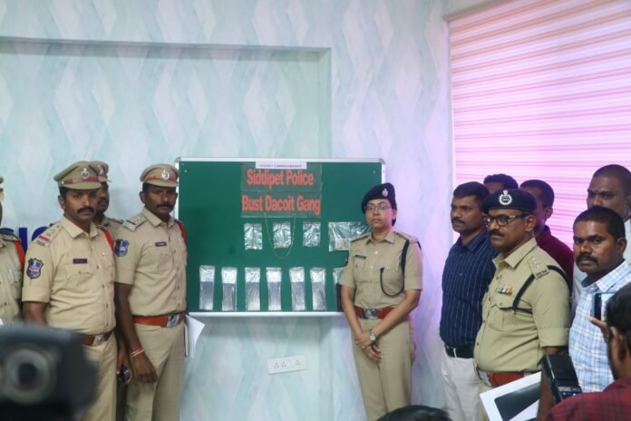 సిద్దిపేటలో సంచలనం సృష్టించిన డాక్టర్ ఇంట్లో దోపిడీ కేసును ఛేదించిన పోలీసులు,9 మంది నిందితుల అరెస్ట్ – 20 లక్షల విలువైన ఆస్తి రికవరీ కేసును ఛేదించడంలో చాకచక్యంగా వ్యవహరించిన సిద్దిపేట రూరల్ మరియు సి సి ఎస్ బృందాలు.సిద్దిపేట రూరల్ పోలీస్ స్టేషన్ పరిధిలోని బురుగుపల్లి ‘చెర్వితా మెడోస్’లో గత ఏప్రిల్ 4వ తేదీన ఒక డాక్టర్ ఇంట్లో జరిగిన సంచలనాత్మక దోపిడీ కేసును సిద్దిపేట పోలీసులు కేవలం 72 గంటల్లో ఛేదించారు. ఈ కేసులో నిందితులైన 9 మందిని అరెస్ట్ చేసి, వాళ్ల నుండి సుమారు 20 లక్షల రూపాయల విలువైన సొత్తును స్వాధీనం చేసుకున్నట్లు సిద్దిపేట పోలీస్ కమిషనర్ ఎస్. రష్మీ పెరుమాళ్, ఐపిఎస్ వెల్లడించారు.ఘటన వివరాలు:ఏప్రిల్ 4వ తేదీ రాత్రి 8:00 గంటల సమయంలో, సిద్దిపేటలోని బురుగుపల్లిలో గల డాక్టర్ నివాసంలోకి గుర్తుతెలియని దుండగులు చొరబడ్డారు. ఇంట్లోని వారిని కత్తులతో బెదిరించి, తాళ్లతో కట్టివేసి, నగదు మరియు బంగారు ఆభరణాలతో పారిపోయారు. బాధితుల ఫిర్యాదు మేరకు సిద్దిపేట రూరల్ పోలీసులు కేసు (సి ఆర్ . నెంబర్. 62/2026, యూ / ఏ ఎస్ 331(4), 310(2), 317 (2) ఆర్ / డబ్ల్యూ 49 బి.ఎన్.ఎస్) నమోదు చేశారు. కేసు తీవ్రతను దృష్ట్యా నిందితులను పట్టుకోవడానికి 10 ప్రత్యేక బృందాలను ఏర్పాటు చేశారు. ఇన్వెస్టిగేషన్ ఆఫీసర్ (సీఐ ఎం. శ్రీను) బాధితుల ఇంటి వద్దే ఫిర్యాదు స్వీకరించి, అక్కడే, ఎఫ్ ఐ ఆర్, కాపీని అందజేశారు. నిరంతరంగా 72 గంటల పాటు శ్రమించి ఈ కేసును ఛేదించారు.ఈ దోపిడీకి మాస్టర్ మైండ్ బెల్లంపల్లికి చెందిన రిటైర్డ్ ఆర్మీ ఉద్యోగి నరేంద్రుల శ్రీకాంత్ @ క్రాంతి (ఏ 1). ఇతడు రామగుండం ఐఓసీ లో సెక్యూరిటీ గార్డుగా పనిచేస్తూ, విలాసవంతమైన జీవితానికి అలవాటు పడి సులభంగా డబ్బు సంపాదించాలని ఈ ప్లాన్ వేశాడు. శ్రీకాంత్ తన స్నేహితులైన రాజేష్, శ్యామ్ మరియు చంద్రశేఖర్లతో కలిసి దోపిడీకి ప్లాన్ చేశాడు. ములుగు, భద్రాచలం ప్రాంతాల్లో నేర చరిత్ర కలిగిన గణేష్, ప్రేమ్ చంద్, పవన్ లను ఈ గ్యాంగ్లో చేర్చుకున్నాడు.ఏప్రిల్ 4న నిందితులు రెక్కీ నిర్వహించి, రాత్రి 8 గంటలకు డాక్టర్ ఇంటి ప్రహరీ గోడ దూకి లోపలికి ప్రవేశించారు. ఇద్దరు మహిళలు, ఇద్దరు పిల్లలను కత్తులతో బెదిరించి 8.6 తులాల బంగారం, 1 లక్ష నగదు, ఫోన్లను దోచుకున్నారు. అనంతరం బాధితులను చార్జింగ్ కేబుల్స్ మరియు టవల్స్తో కట్టివేసి పారిపోయారు.అరెస్ట్ అయిన నిందితుల*1. నరేంద్రుల శ్రీకాంత్ @ క్రాంతి (41) – రిటైర్డ్ ఆర్మీ (మాస్టర్ మైండ్)2. కల్లూరి గణేష్ (30) – కూలీ, ములుగు (పాత నేరస్థుడు)3. ముత్యబోయిన ప్రేమ్ చంద్ (21) – కూలీ, ములుగు4. బడిశె పవన్ (23) – కూలీ, ములుగు (పాత నేరస్థుడు)5. దుగుట చంద్రశేఖర్ (44) – సింగరేణి ఉద్యోగి, గోదావరిఖని)6. మడిశెట్టి రాజేష్ (39) – డ్రైవర్, గోదావరిఖని”7. అక్కపాక శ్యామ్ (39) – రియల
